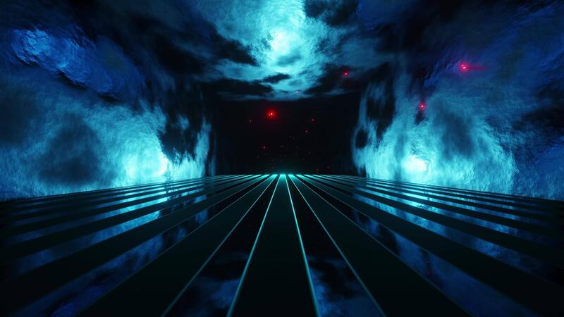 Futuristic tunnel with blue lights and clouds in the background. Loop animation Pro Video